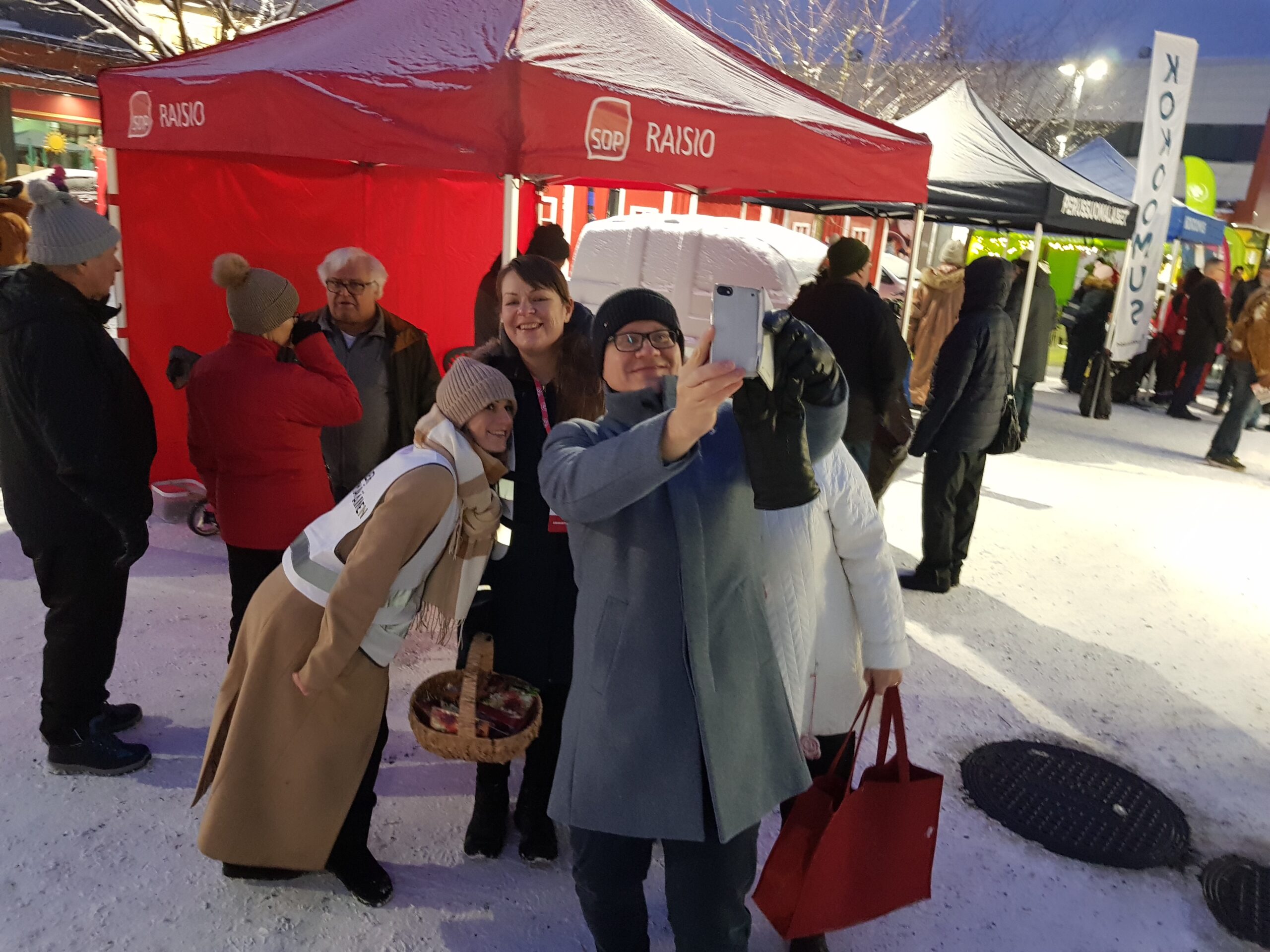 - Raisiossa joulumarkkinoilla, Kuvassa Ari, Erika ja Maaret