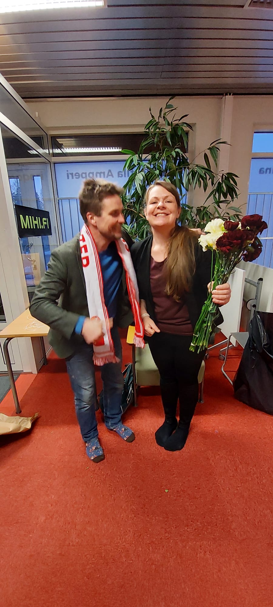 - Juuso Ranne Kaarinan työväenyhdistys Uurtajien puheenjohtaja toi kukkia vaalivalvojaisiin.
